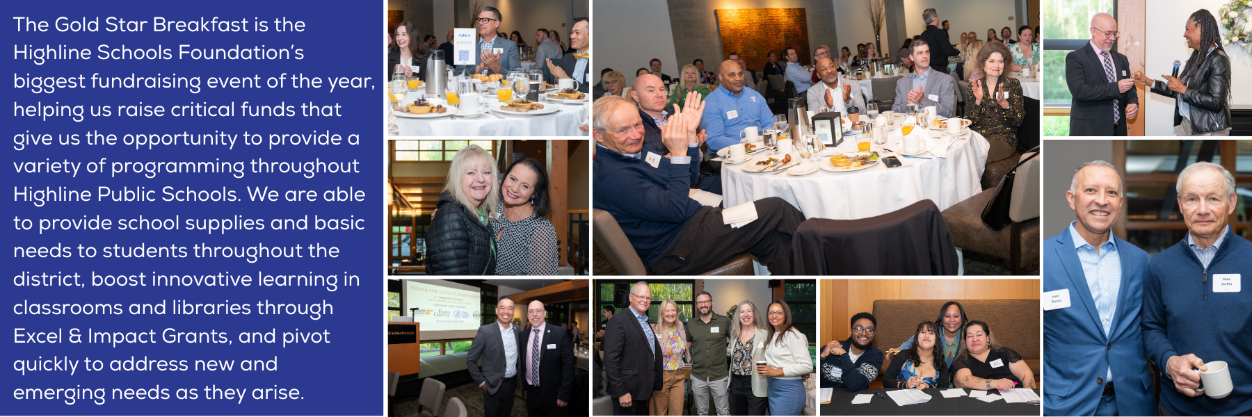 Our Gold Star Breakfast is a fantastic morning, filled with celebration and thanks. Held each year at the Cedarbrook Lodge in SeaTac, we spend the morning celebrating outstanding educators, staff, and volunteers in the district, and hearing from leaders in the Highline Public Schools community. Tickets will be available in early spring – join us for an inspiring start to your day!ย